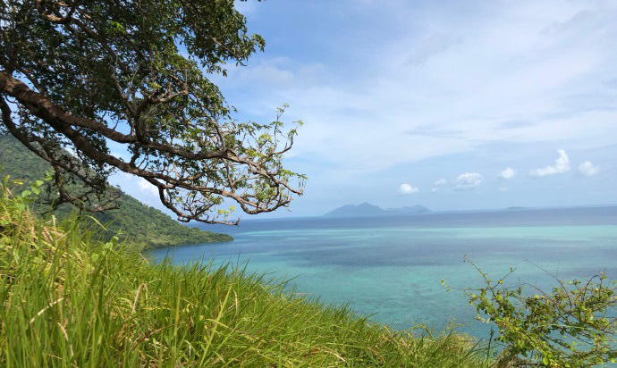 Timbun Mata Island ( Pulau Timbun Mata ) is an island belonging to Malaysia in the open to the Celebes Sea Darvel Bay. The island is located about 20 kilometers northwest of Semporna and is the largest island within the Darvel Bay. It is predominantly forested tight. Its maximum length is about 30.1 km, the maximum width of about 9.7 km. [Note 1] From the flat west coast it rises steadily to Mount Tannabalu, which is located approximately in the middle of the island. The 620 m high, cone- shaped mountain is an extinct volcano. A second summit - the 489 meter high Mount Sedungal - rises at the eastern end of the island. The island is separated by a narrow strait called Trusan Sigalong from the mainland.